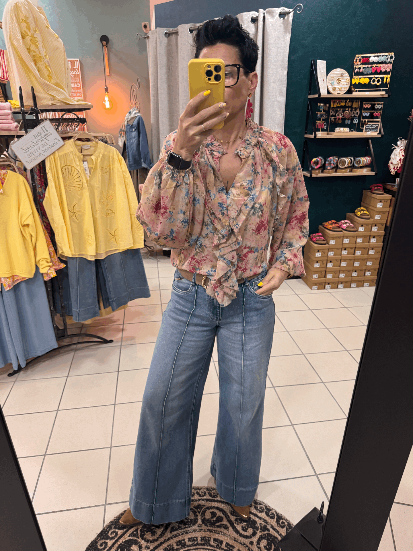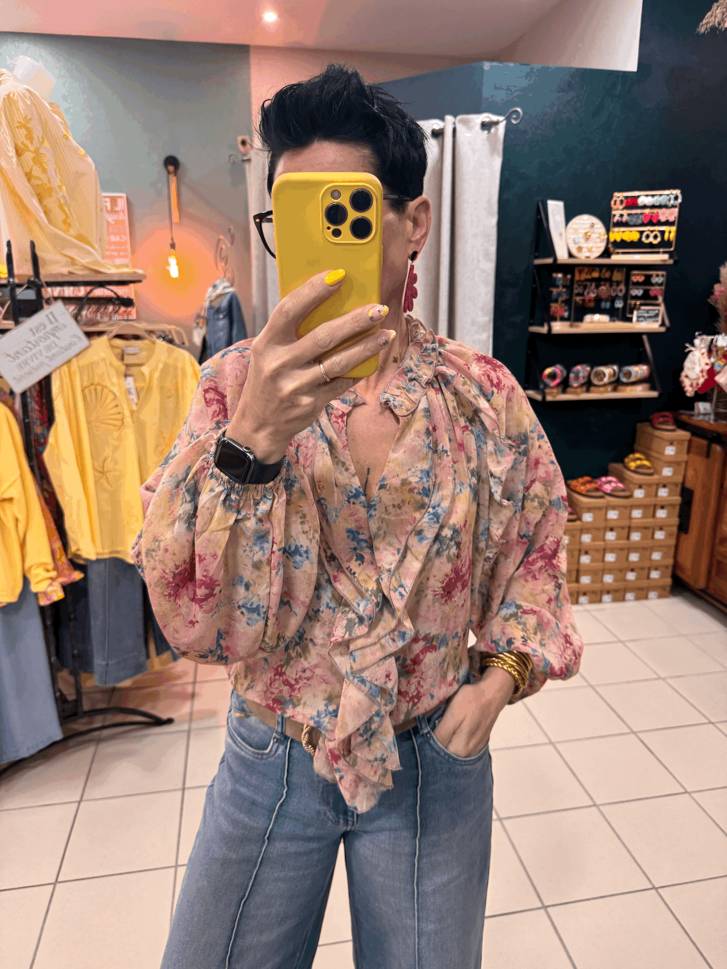 Blouse ample avec volants , manches bouffantes et poignets élastiqués.