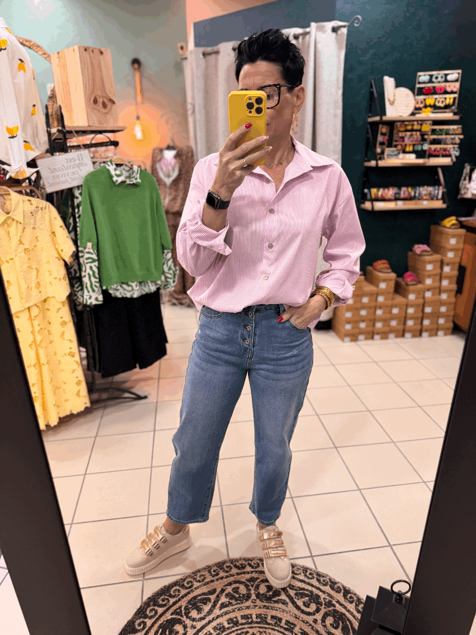 Chemise rayée rose et blanche forme oversize (plus longue à l'arrière)