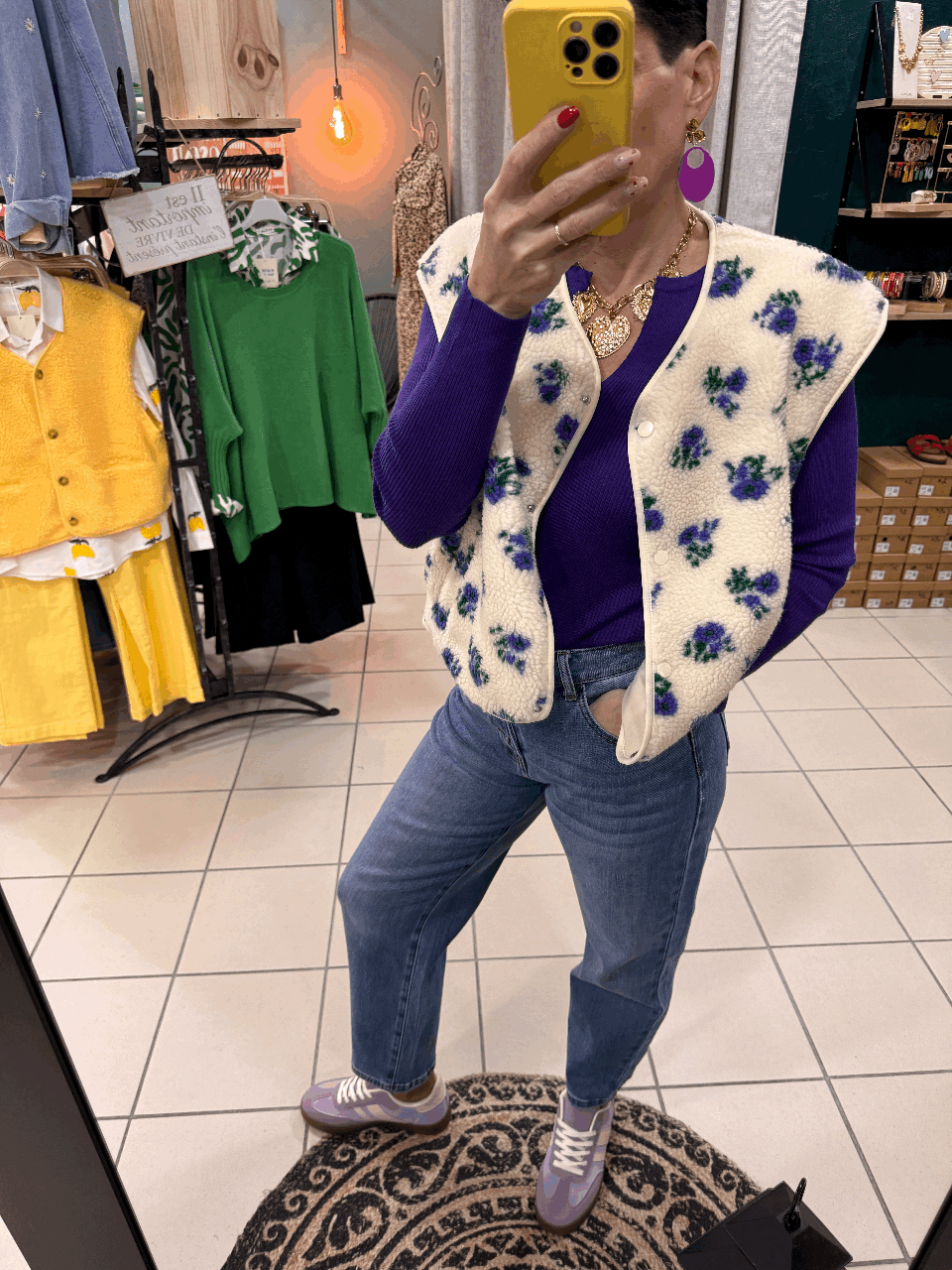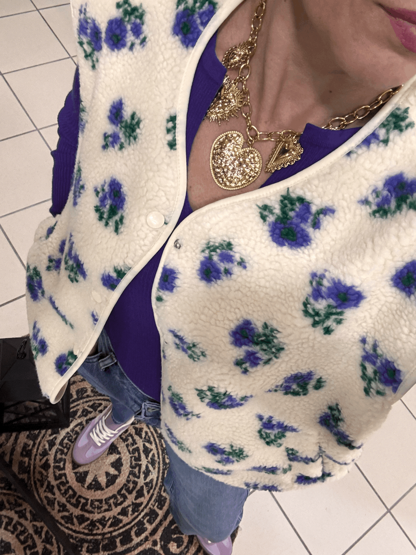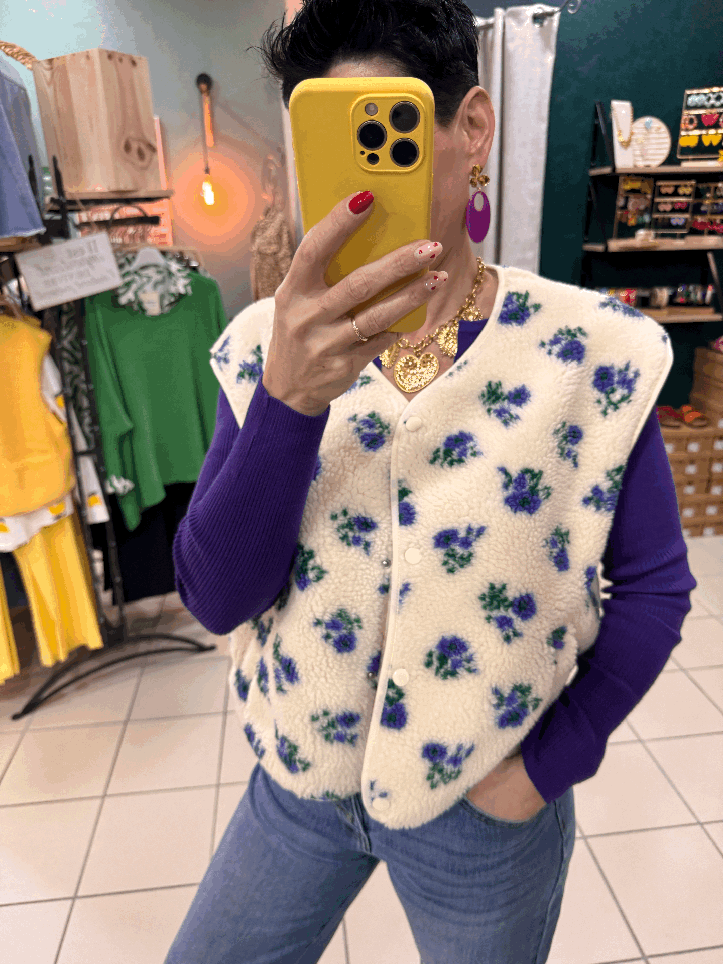 Gilet Bouclette imprimé fleurs violine sur fond beige