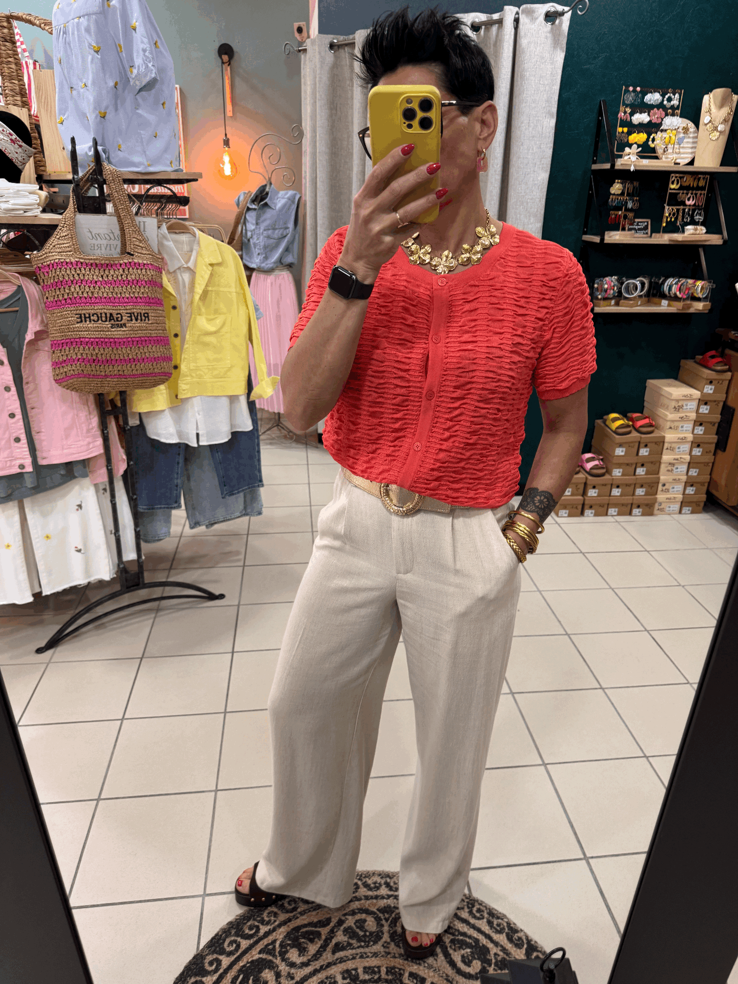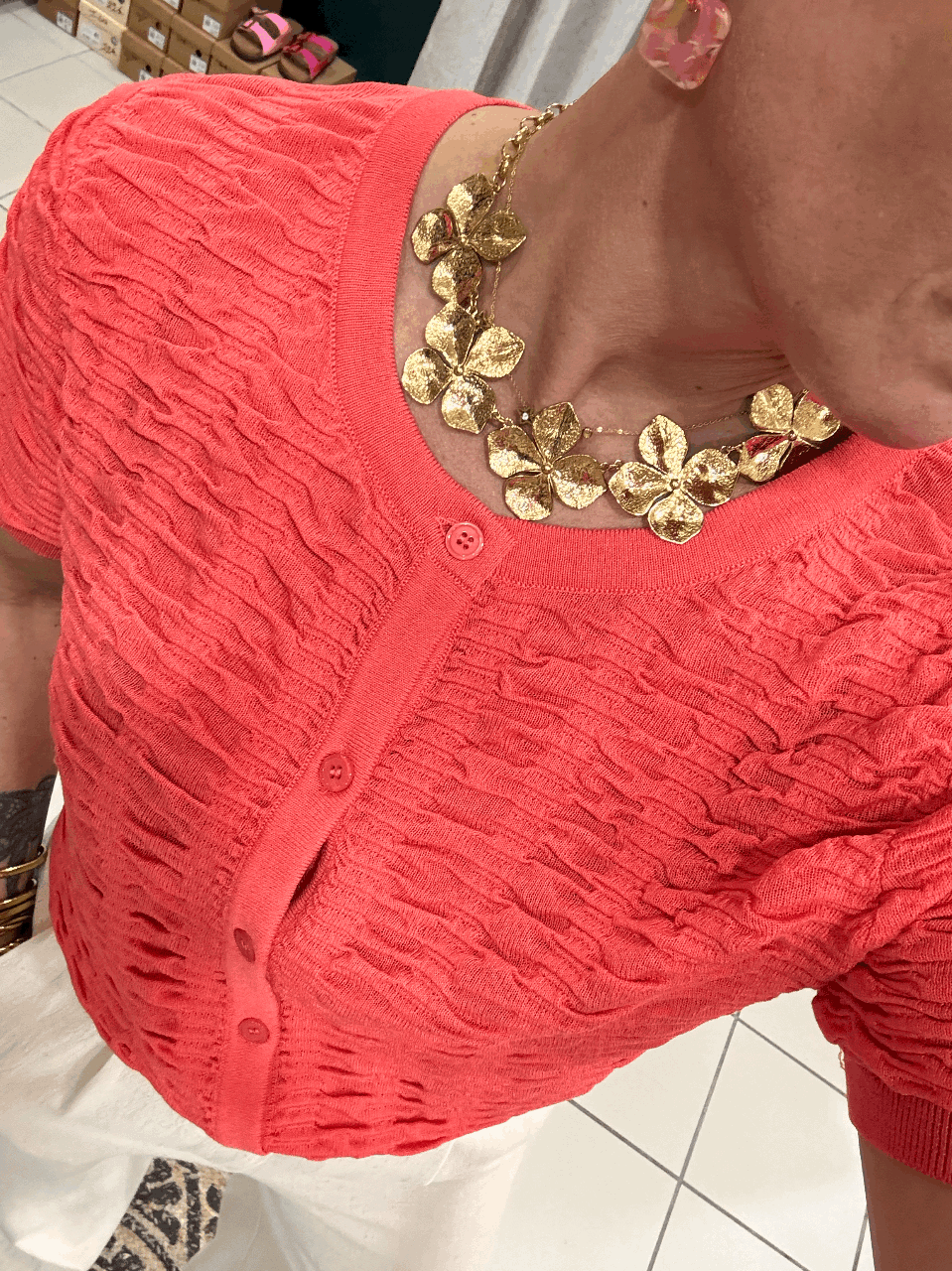 Petit top corail manches courtes, aspect gaufré avec boutons