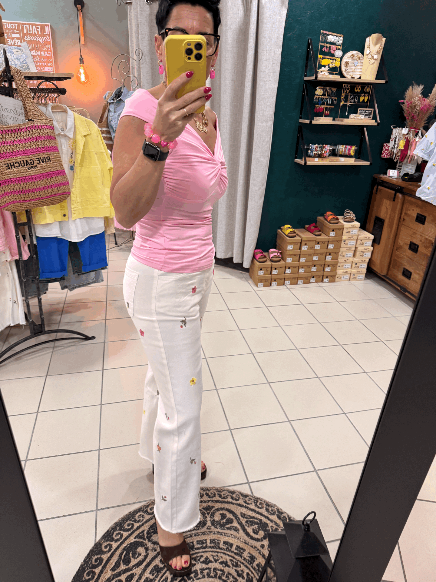 Pantalon sur fond blanc avec des petites fleurs colorées.