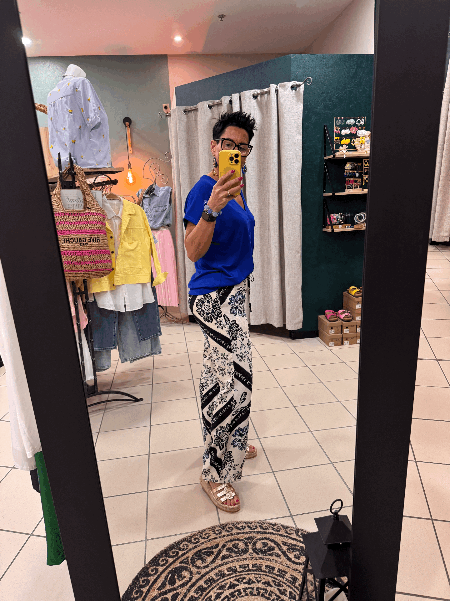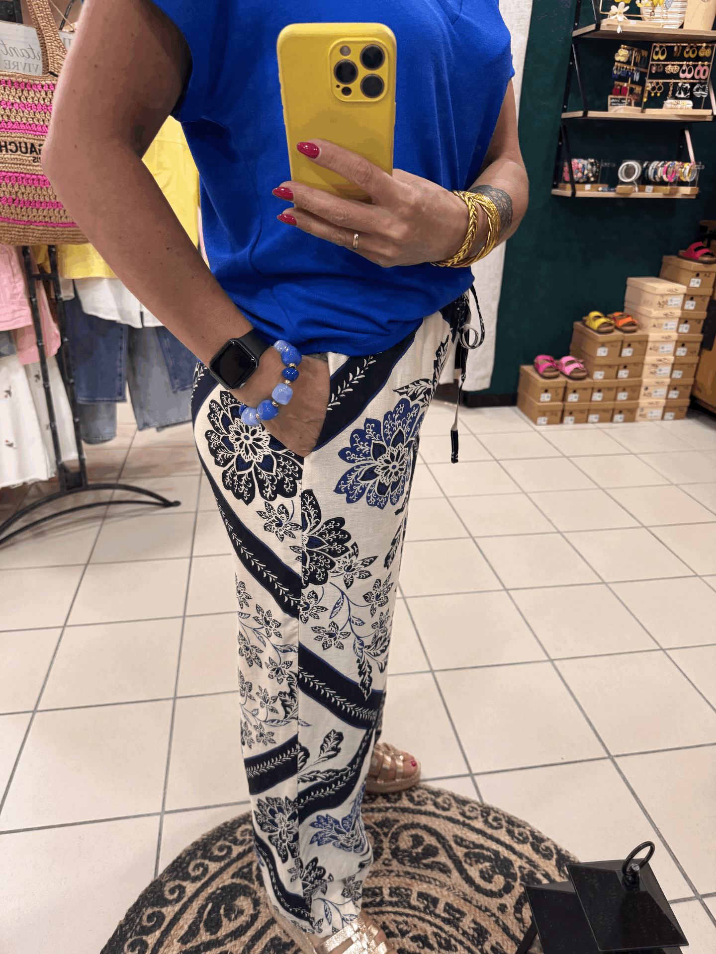 Couleurs : fond écru et imprimé fleuri dans les tons bleus