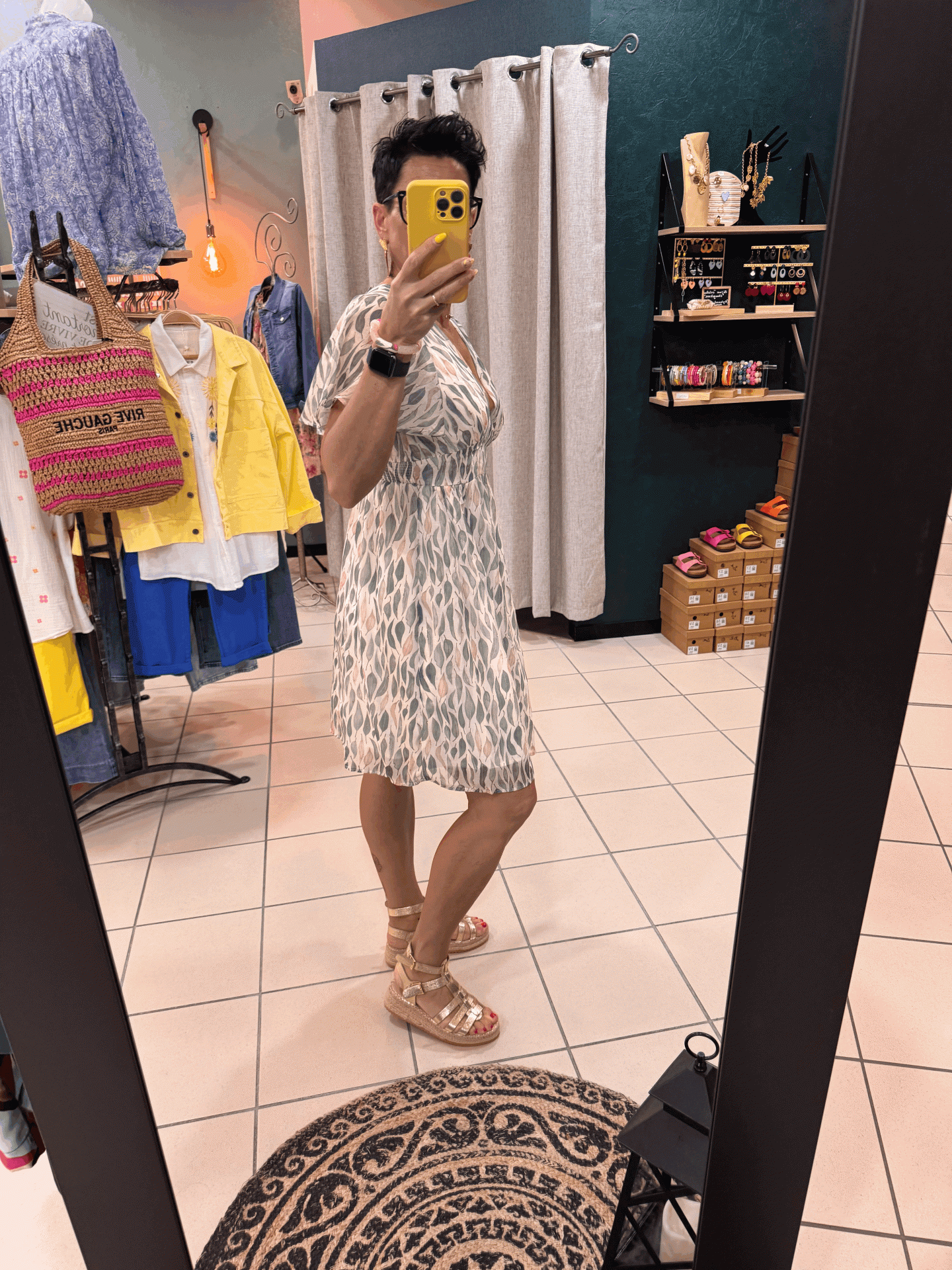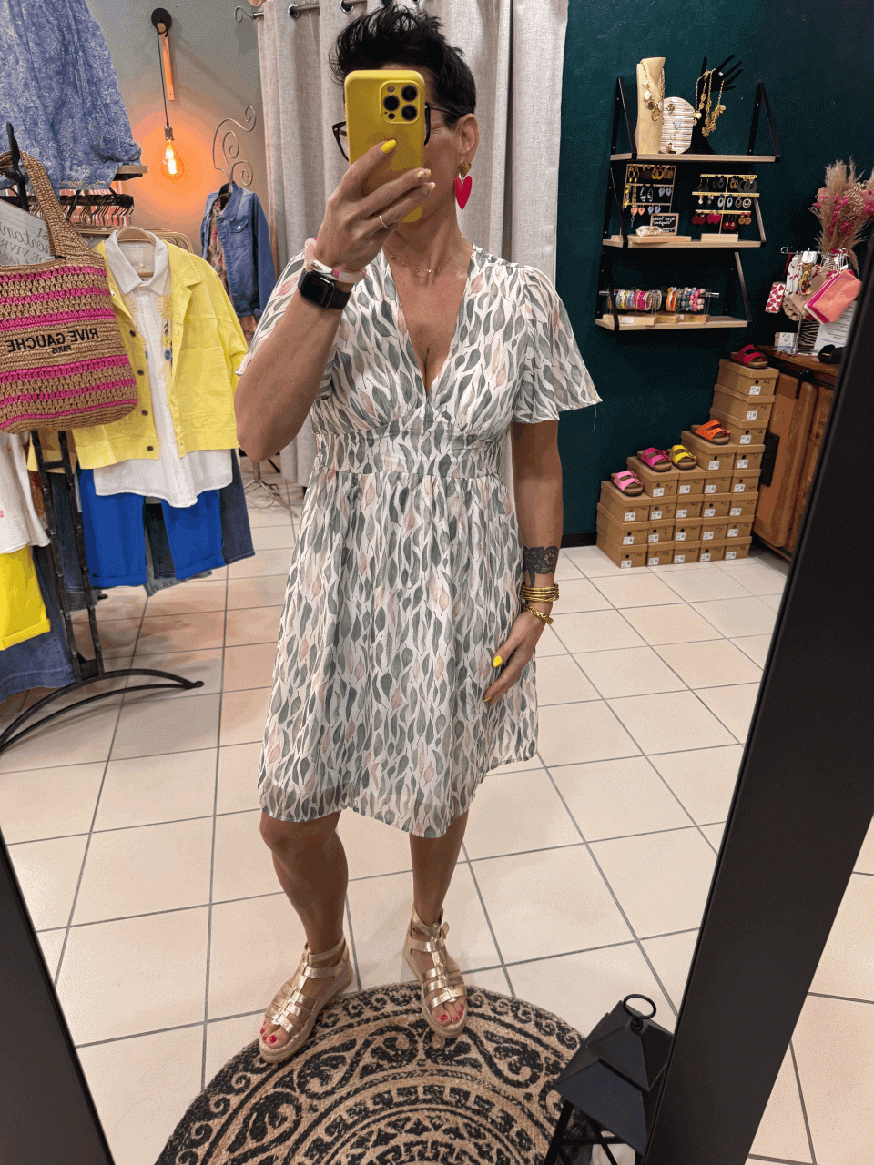Robe courte , vaporeuse , sur fond blanc avec motifs feuillages dans les tons de roses et verts.