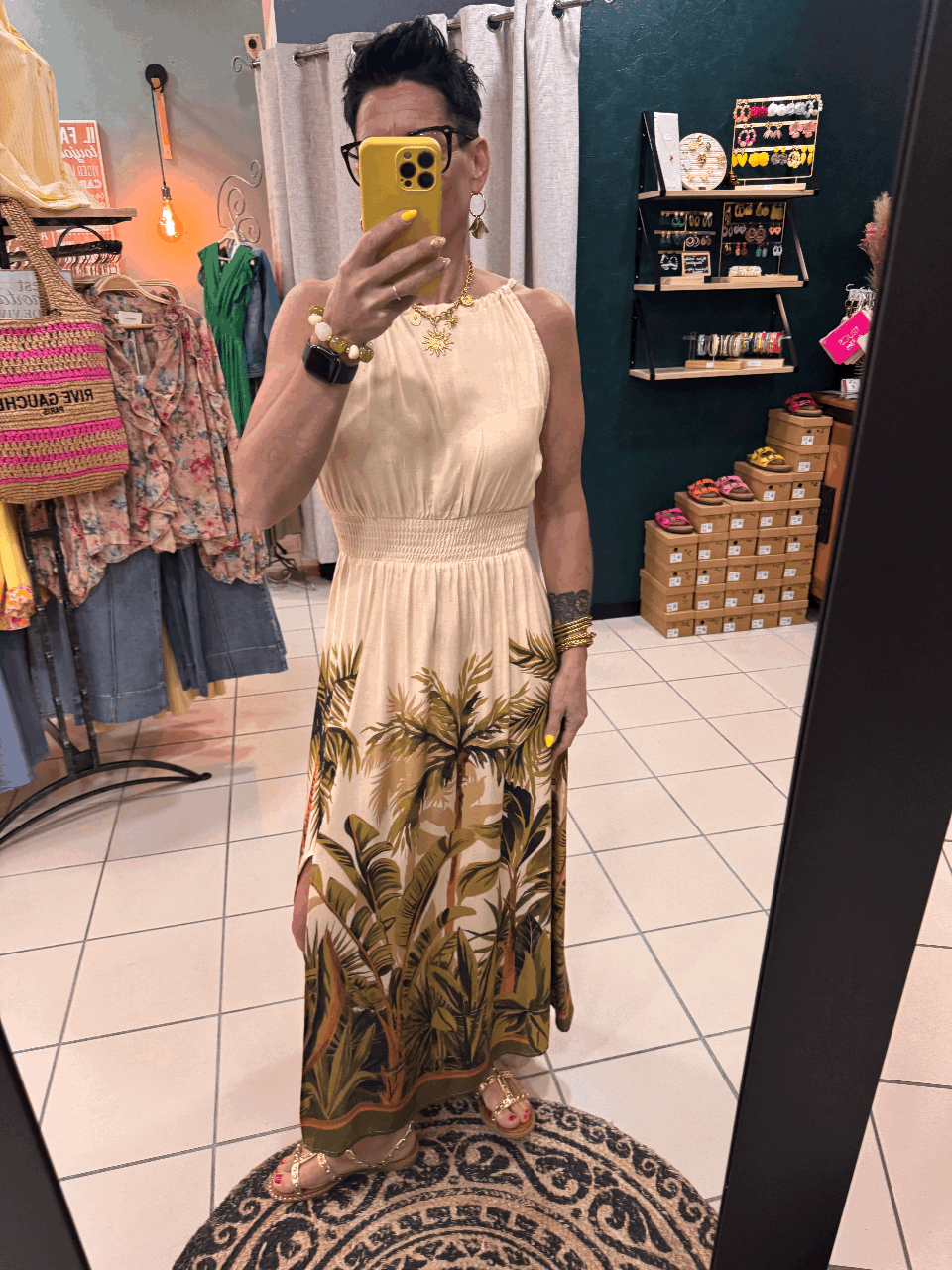 Robe fond ecru imprimée palmier , fendue sur le devant de la jambe , smockée au niveau de la taille , haut de robe à bretelle avec un lien dans le dos.