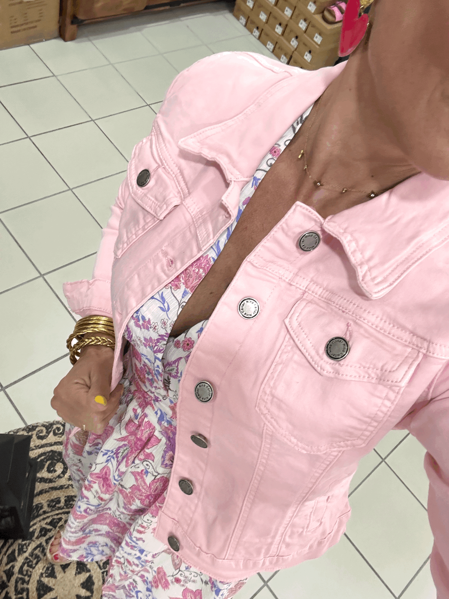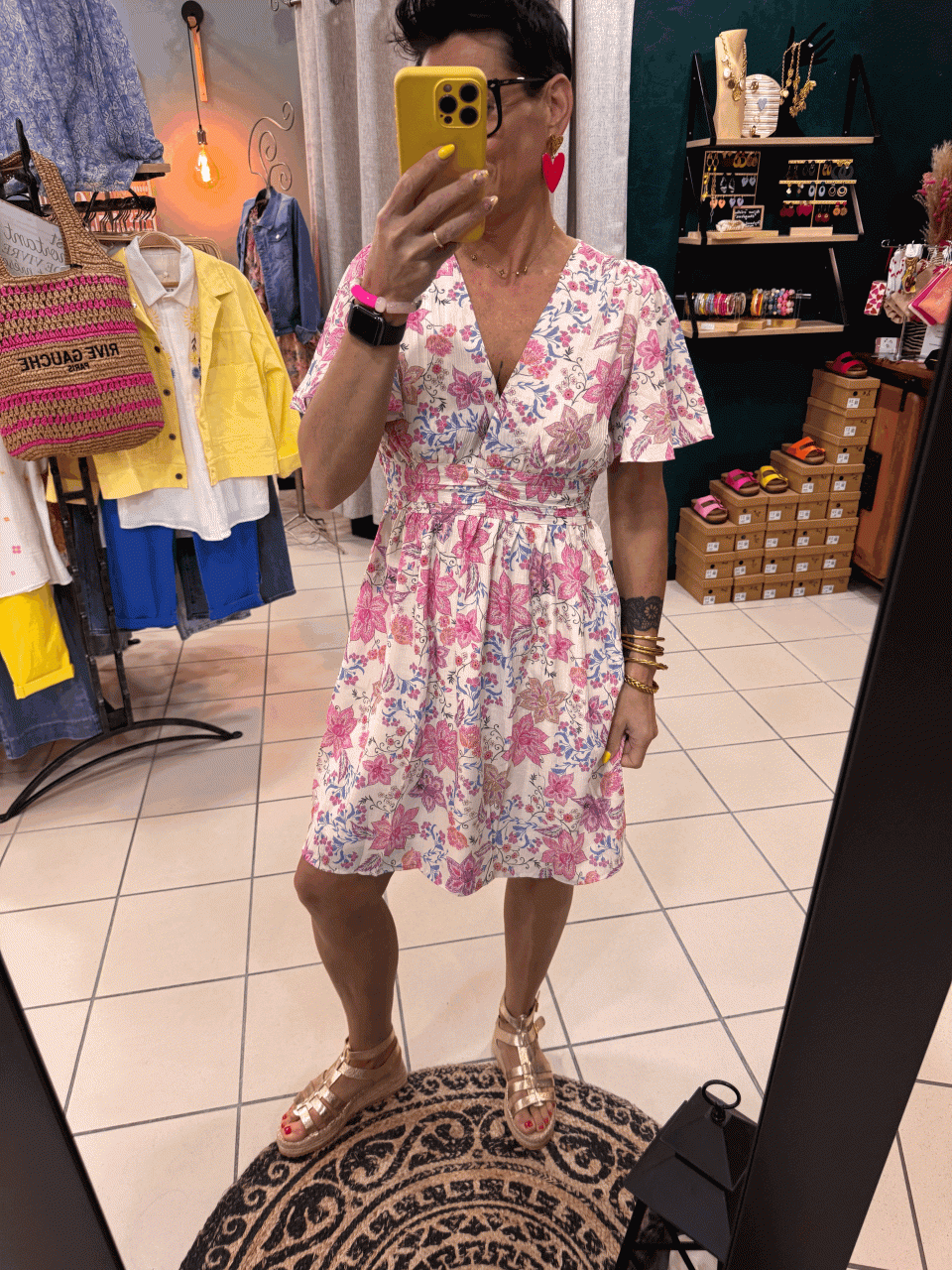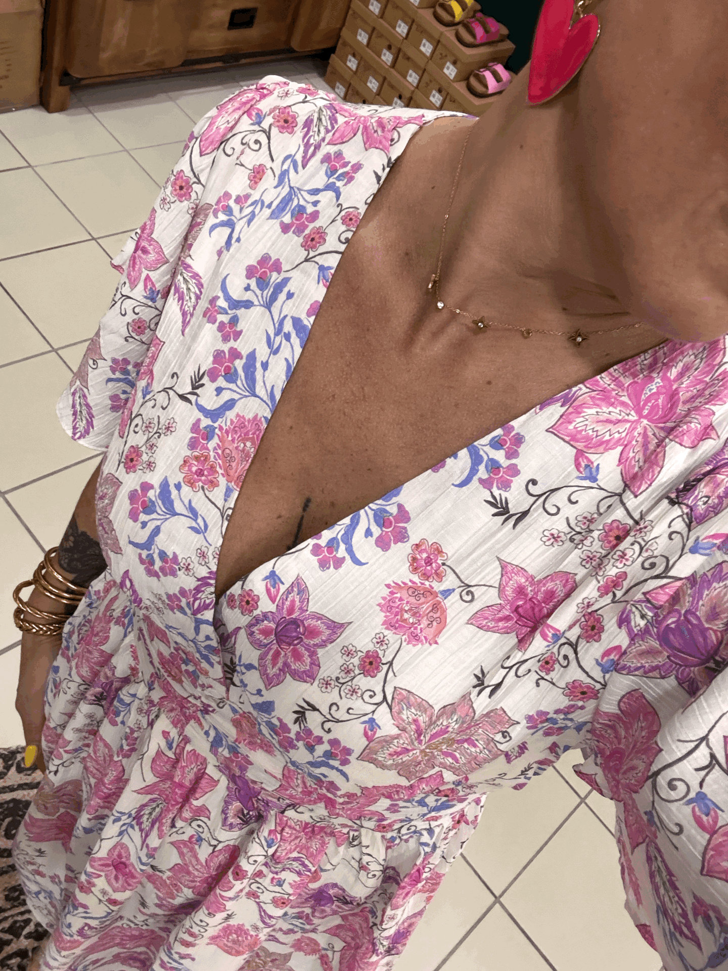 Robe courte , vaporeuse , sur fond blanc avec motifs fleurs dans les tons de roses et violets.
