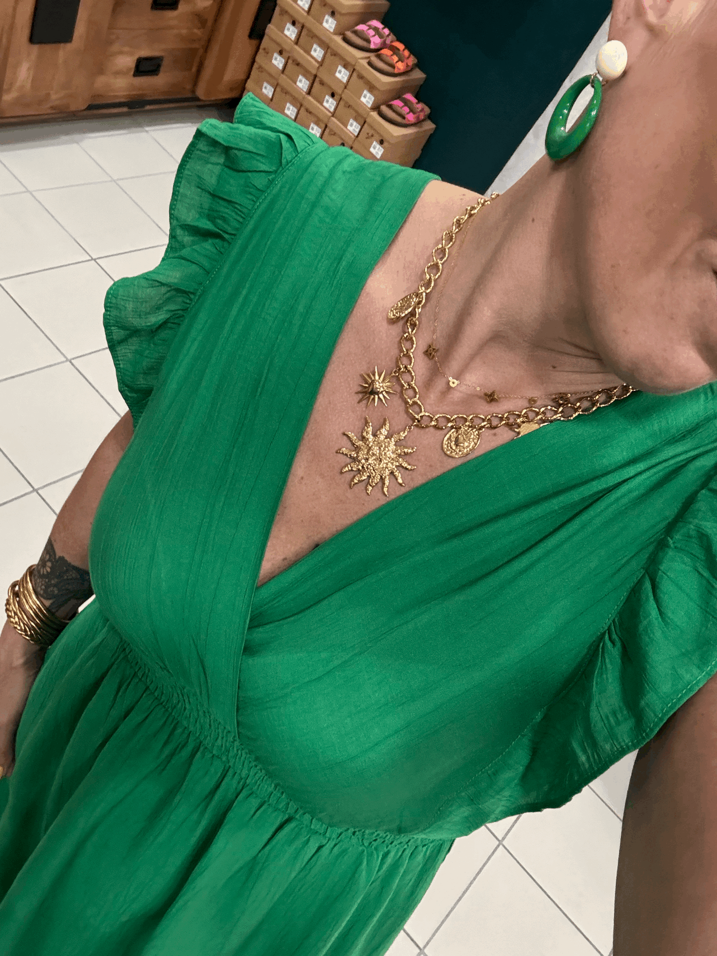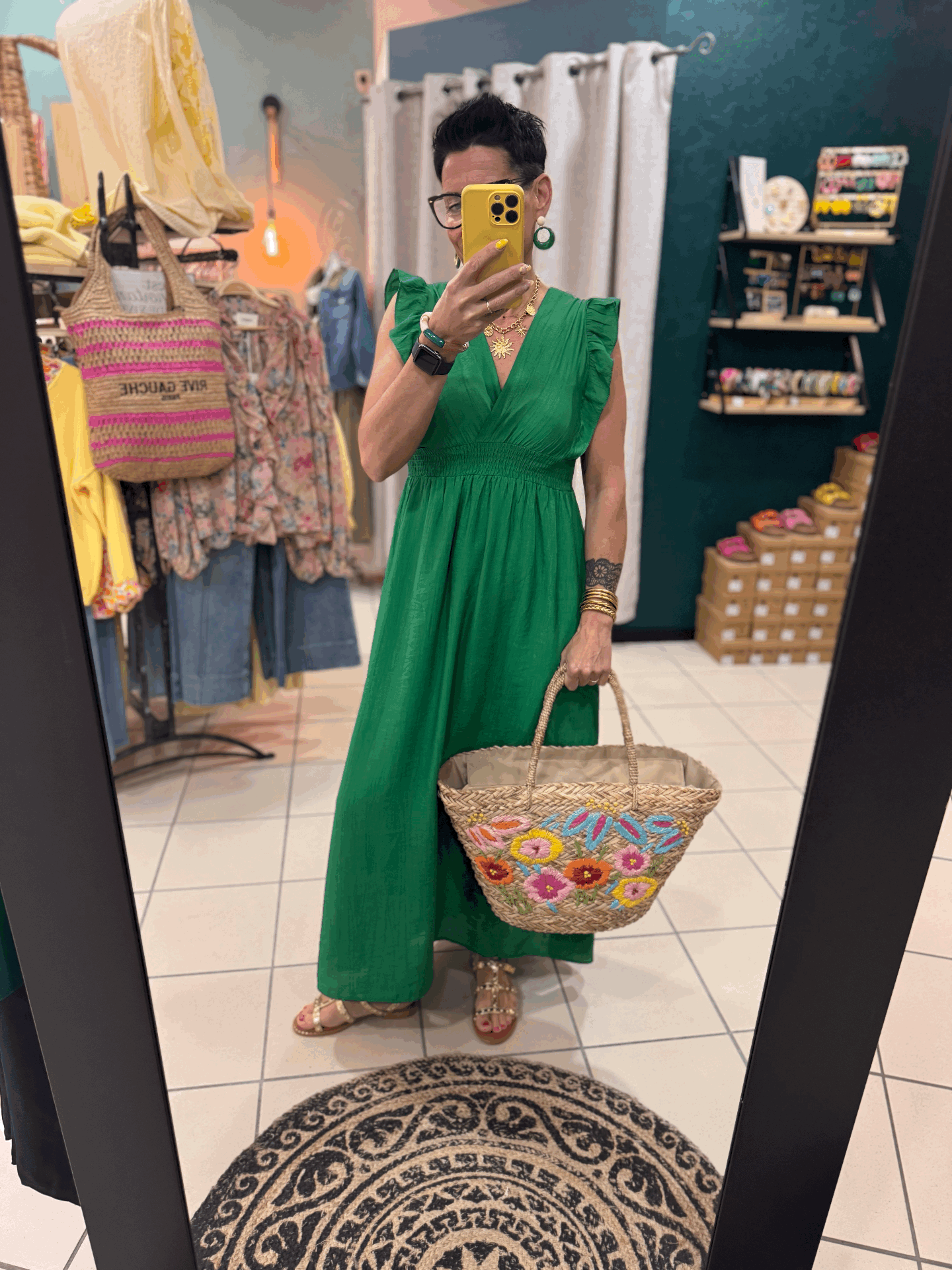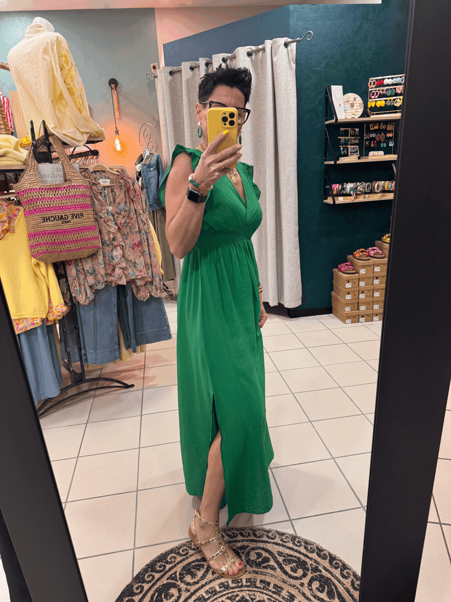 Robe fluide ample , petit volant au niveau de la manche , smockée à la taille , fendue sur le côté gauche et doublée de la taille au dessus du genou.