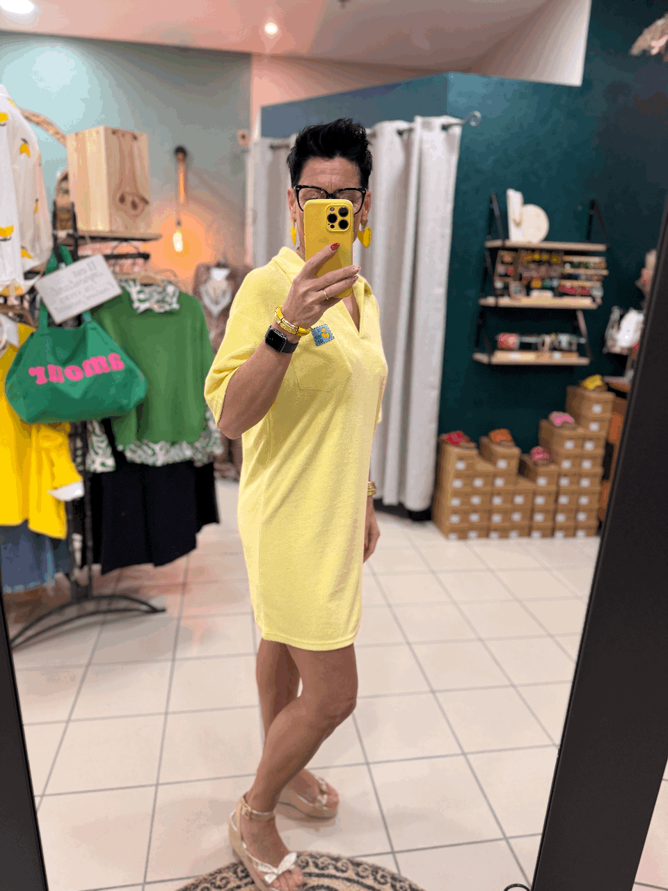 Robe en éponge jaune col polo et petite poche sur le devant