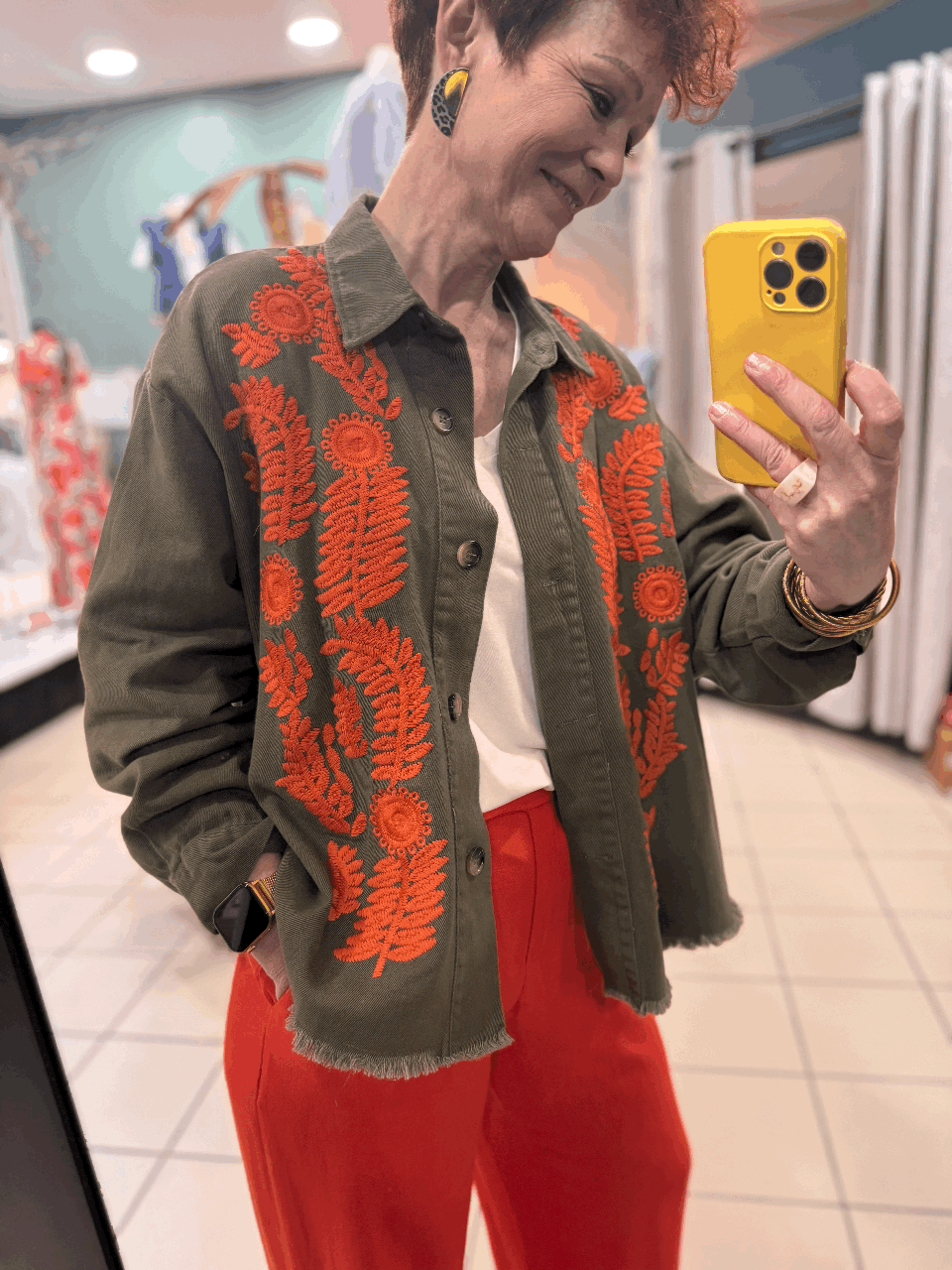 Fond Kaki avec des broderies oranges.